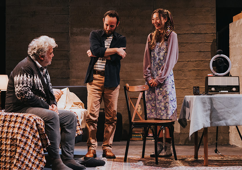 Oyunun hikâyesine gelelim mi o zaman? Televizyonun Karşısında Özel Mülkiyetin Kökeni Üzerine Düşünürken Uyuyakalmışım, Babamın Sesine Uyandım’ı ortaya çıkarırken yönetmeni Görkem Şarkan ve dramaturgu Noyan Ayturan ile nasıl bir çalışma yürüttünüz? Oyuncularla metni hayata geçirme sürecinde neler yaşandı?