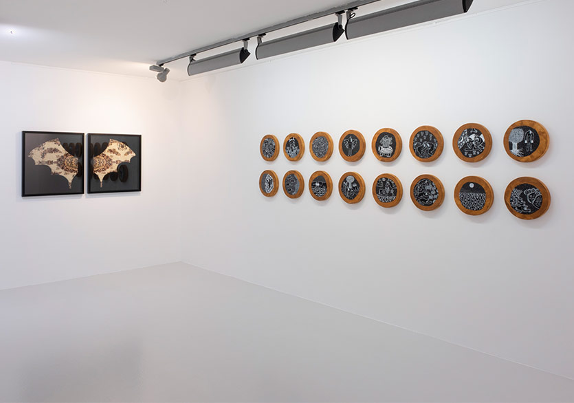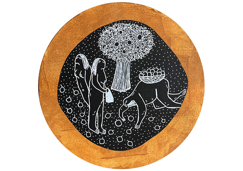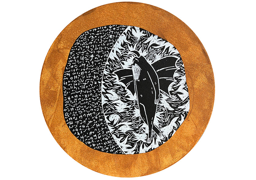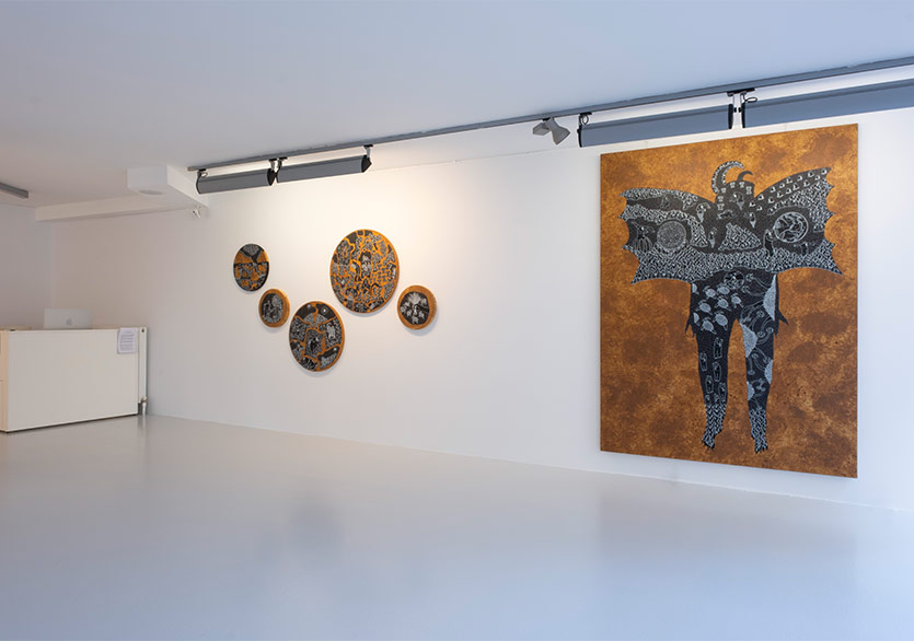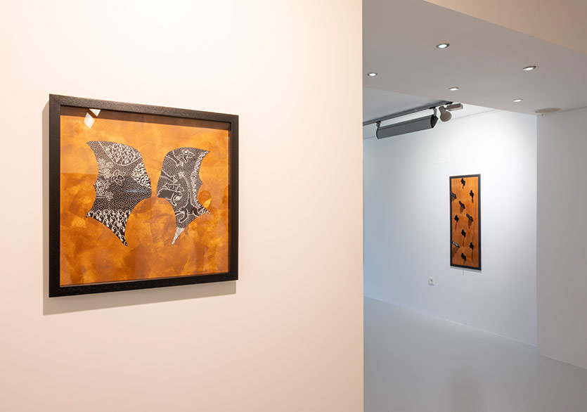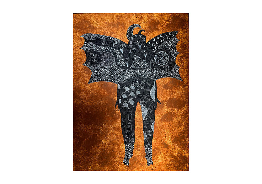 Yeni serinin dikkat çeken bir başka unsuru ise bitki motifleri. Kimi zaman figürlerin kanatlarında filizlenen bu çizimler, geçmişe ve köklerimize uzanan birer ipucu niteliğinde. Sanatçı, yalnızca tuval üzerinde değil, üç boyutlu nesnelerle de bu köprüleri kuruyor: Orijinalinde bitki motifleri bulunan eski bir halıyı, Batman’in kanatları biçiminde keserek kültürel hafızayı somut bir forma dönüştürüyor. Böylece halının kendi deseninden doğan kanatlar, geçmişin dokusuyla geleceğin hayalini aynı bedende taşıyor.