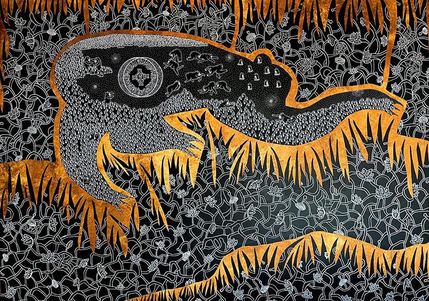 12.000 yıl öncesine uzanan arkeolojik miras, sanatçının tuvallerinde kazılırken, günümüzün yapay zekâ ve dijital teknolojilerinin baş döndürücü hızı da bu hikâyeye dahil oluyor. Bu hız, insanlığı hem heyecanlandırıyor hem de tedirgin ediyor; çünkü geçmişin izleri, hiç olmadığı kadar hızlı siliniyor. Bu kırılma anı, Çiğdem'in Batman’i andıran hem çekici hem de ürkütücü bir figüründe hayat buluyor. Gücü ve karanlık cazibesiyle, teknoloji çağının insanlık üzerindeki ikircikli etkisini temsil eden bu figür, olağanüstü ile tehlikeli olanın sınırında dolaşıyor.