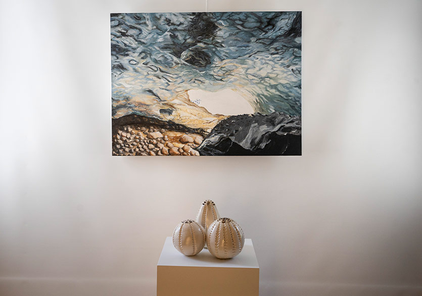 Sergilenen resimlerden bazılarında, çeşitli renk, şekil ve resimsel katmanlar arasında embriyoya benzer formlar, insan gelişimi bağlamında dönüşümün anlamına işaret eder. Burada doğa holistik bir açıdan değerlendirilir ve böylece insanlığı doğanın ayrılmaz bir parçası olarak görürüz. “Dönüşüm” sergisinde renkli, dışavurumcu ve dinamik resimlerin yanı sıra seramik heykeller ve iki boyutlu seramik duvar işleri de yer alıyor. Güher Elçiçek’in seramik işleri daha basit ve son derece minimal olmalarıyla dikkat çekiyor. Dokuları ve ifade biçimleri daha sakin, böylece tüm dikkat, eserdeki genel forma odaklanıyor. Bu işlerdeki renklendirme de basit ve minimal olduğundan formun estetik gücü arttırılıyor.