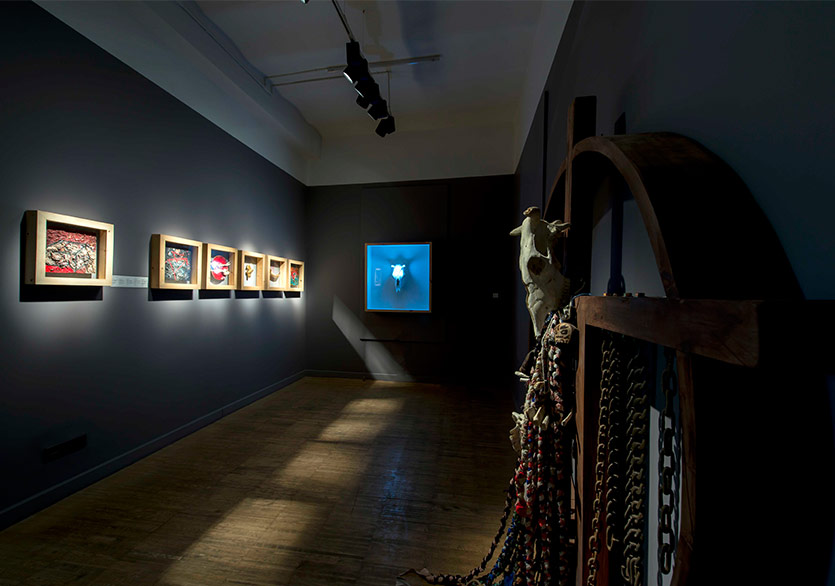 Oda içerisinde seri halinde gerçekleştirdiğim kafatası yerleştirmeleri el yapımı ama geri kalan çalışmalarımda kullandığım kafatasları gerçek. Tilki, köpek ve dana kafatasları yer alıyor. Hatta kafataslarından biri hâlâ kemiksel olarak canlı, kurt üretiyor. Galeriye yerleştirdikten sonra bile birkaç defa ilaçladık.