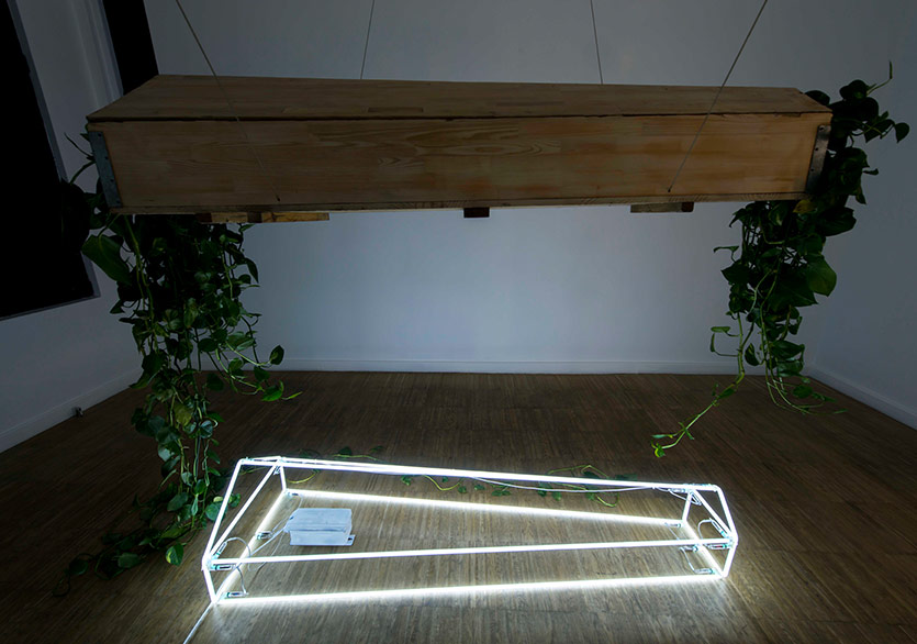 Tabutun sergilendiği odanın duvarında bir eskiz mevcut. İlk o eskiz üzerinden planlamıştım bu çalışmayı, ölüm üzerine bir seri yapmak istedim. Tabutla ilgili hâlâ aklımda birkaç iş de mevcut. Tabut ile olan ilk yakınlığım ise 14 - 15 ay önce yakın bir arkadaşımın motosiklet kazasında vefat etmesine dayanıyor. Tabut yerleştirmesinde kullandığım neon ışıklar “Işıklar içinde uyusun” cümlesinden kaynaklı. Bu cümle halk arasında yaygın olarak ölen kişinin arkasından söylenen iyi bir temenni nur içinde yatsın gibi, tabutun içerisine yerleştirdiğim sarmaşık ise ölümden sonra tekrar yaşamın olacağı durumuna işaret ediyor. Yani aslında inanç sistemimiz değişse dahi, bazı anlamlar sadece isimsel olarak farklılık gösteriyor. İslamiyet’te cennet - cehennemin, ahiret inancı durumu olarak şekillenmesi gibi.