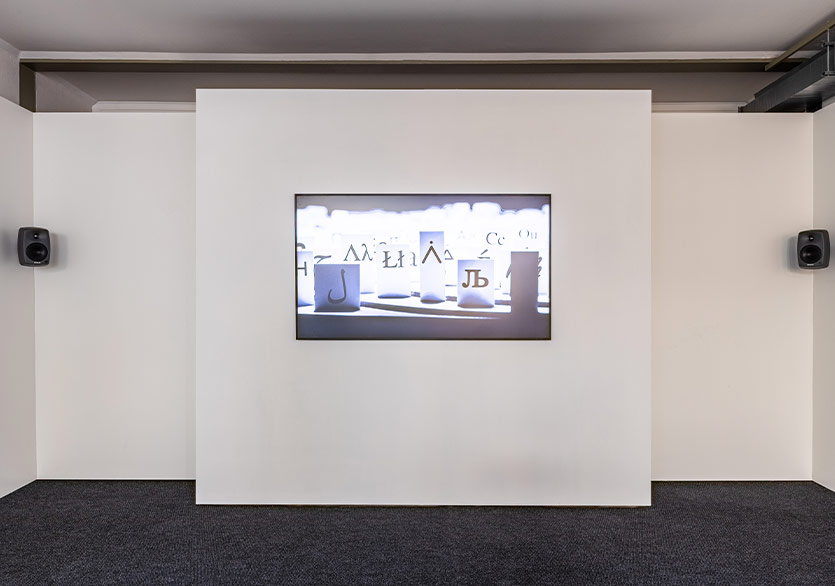 Yerleştirme, siyah–beyaz 6 dakika 32 saniyelik bir video ve dört kanallı ses düzeninden oluşuyor; videoda gördüğümüz harflerin heykelsi maketi mekânda yer alıyor. Harflerin ağır ritimde belirişi ve kayboluşu, bir soluk alıp verme hâli yaratıyor; sanki her harf hafızaya kazınıp yeniden siliniyormuş gibi. Dört kanallı ses düzeni ise farklı ses, ton ve söyleyiş biçimlerinin üst üste bindiği çok katmanlı bir uğultu kuruyor. Kimi zaman birleşen ve dağılan bu ses kümeleri, kimliğin sabitlenemez doğasını açığa çıkarıyor.