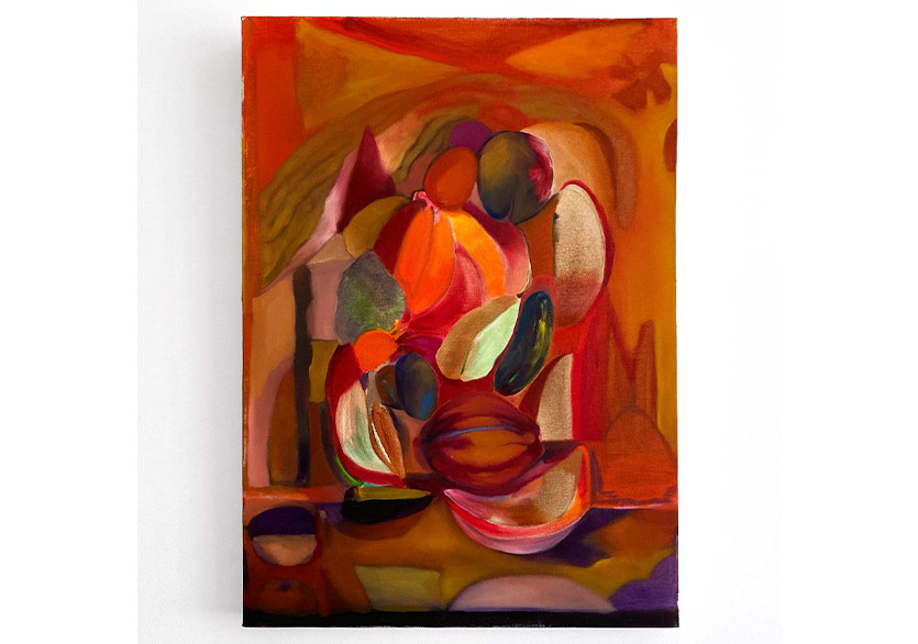 Kullandığım meyve figürlerini sadece resmedilen meyve olarak değil, tuvalin yüzeyinde oluşan bir form ve renk çalışması olarak görüyorum.