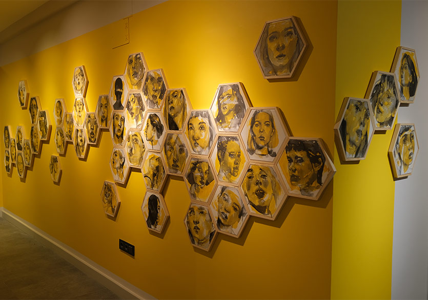 Alt kat tıpkı evimdeki gibi, ışıksız bir alan olduğu için renklerle daha pozitif bir mekâna dönüştürmeye çalıştım. Arada bir güneşin yine kısa süreliğine uğradığı üst katta güneşlenip, tekrar aşağıya inerek çalışmaya devam ettim. Burada geçirdiğim zamanlardan ve deneyimlediğim durumlardan kısa kesitler gösteren bir video da izleyeceğiz. Giriş katı ise daha pozitif ve dingin bir seri resimden oluşuyor. İnsanın içini sıkmayan bir mekân olmasına rağmen, karamsar kadın figürleri yer alıyor. İki farklı dünyamı ve yin yang gibi olan dengesini hissettirmeye çalıştım.