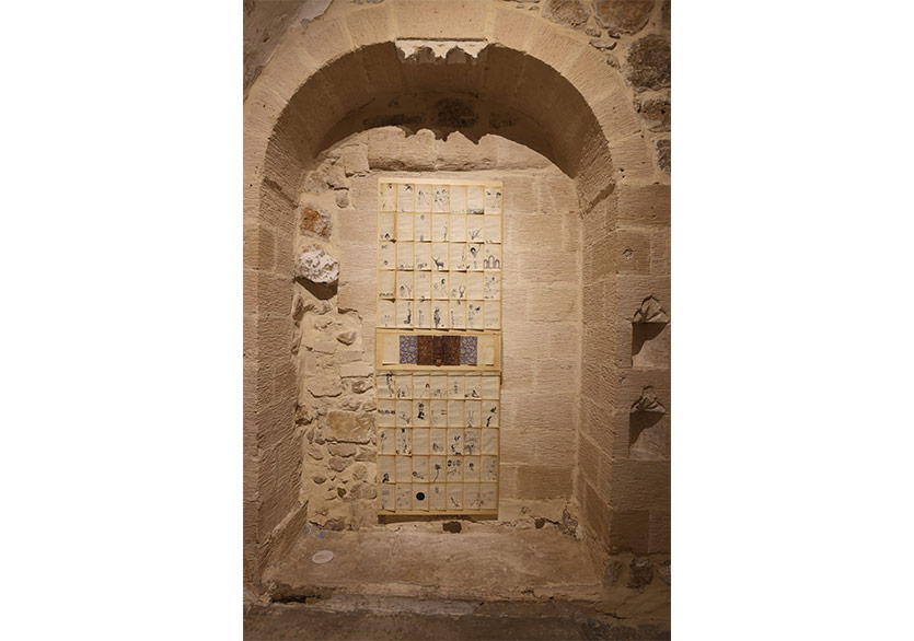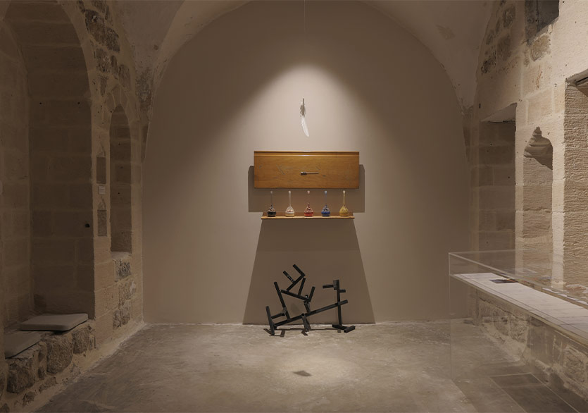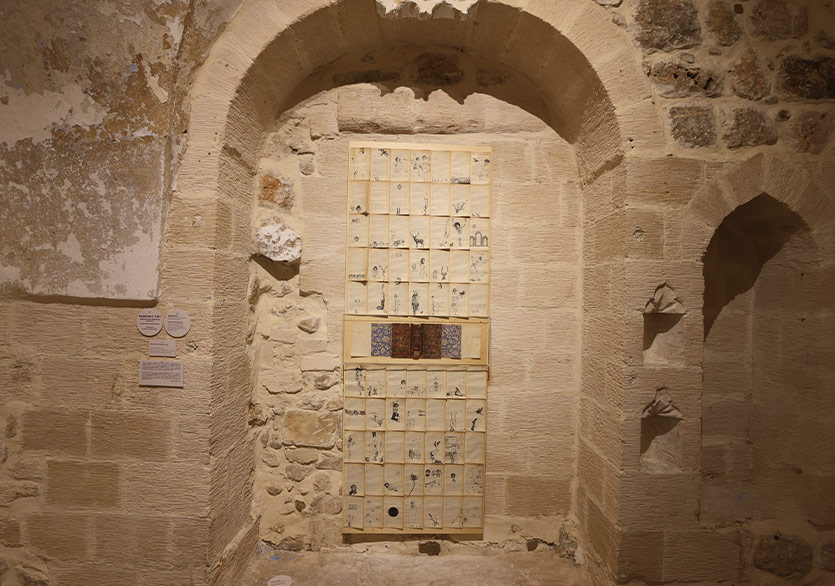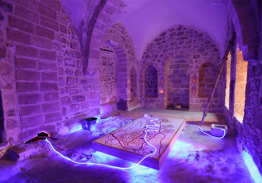 Mardin’e ovadan ve bina cephelerinin oluşturduğu yüzeyden bakışla başlayan sergi, Mardin’in doğasına, bir zeytin ağacına varıyor. Kentin içindeki bir başka ağacın söyledikleri ile çıkılan içsel yolculuk ise bir travmaya sanatın iyileştirici pratikleriyle yaklaşıyor. Bu toprakların çok kültürlü yapısına eklemlenen bir kitap, üzerine çizilen resimlerle değişip sergide okunur, görünür hâle geliyor. Kentin bir su kaynağından yola çıkan son çalışma ise kentin su kaynaklarının izini sürerken Mardin’de yer altına kadar iniyor ve suyun akışı üzerinden Mardin’e dair bir harita çıkarıyor.