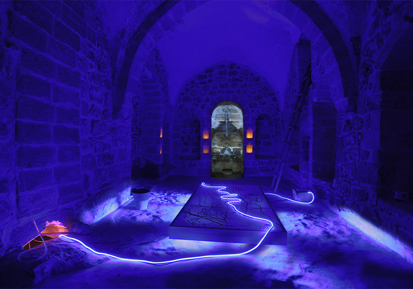 Serhat Kiraz ve Ayşe Ceren Solmaz sanatçı eşleşmesi döneminde üretilen Bu Bir Su Öyküsüdür adlı yerleştirme ise üretildiği ve sergilendiği mekânın yapısı, dokusu, tarihi ile de etkileşime geçen bir çalışma. Sanatçılar araştırma sürecinde, sergi mekânının altında bir kuyu olduğunu fark eder ve bu kuyu onların yaratıcı süreçlerinin ilk kaynağı olur. Araştırmaları sırasında ise Mardin’de neredeyse hemen her yapının altında bu türden kuyular olduğunu öğrenirler. Roma dönemine kadar geriye gittiğini düşündükleri bu su kuyularının, kentteki tarihi çeşmelerin, su kaynaklarının birçoğu zamanla kurumuştur. Hem kuruyan yer altı su kuyularını hem de hâlâ kullanımda olan yer yüzündeki tarihi çeşmelerin izini süren sanatçılar Mardin’in su haritasını çıkarır. Ceren Solmaz tek tek bu tarihi çeşmeleri ziyaret edip fotoğraflayarak harita üzerinde konumlandırmış. Sergilendiği odanın altındaki kuyudan çıkan ve kıvrılarak harita üzerinde akan mavi ışık ise, haritası çıkarılan bu su yolunu temsil eden bir ışık-su izine dönüşmüş.