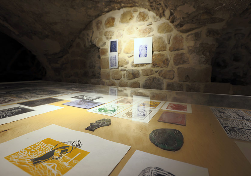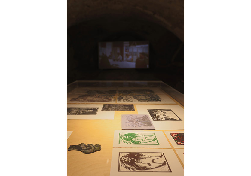 Küratörün sorduğu “Bu bir aylık deneyim sizde hangi cevheri ortaya çıkardı?” sorusuna Fulya Çetin “Yeni Bir Göz” cevabını vermiş. Bu yeni ve farklı açıdan bakışın, birbirinin gözünden aynı şeye bakmanın ortaya çıkardığı etkileşim, şimdi karşımızda bizlere bakıyor. Hemen sağda yer alan mağarada ise iki sanatçının birlikte ürettikleri süreçte davet ettikleri Gümüş Özdeş yürütücülüğünde gerçekleşen baskı atölyesinin videosu akıyor. “Tak, tak!” birlikte vurulan yumrukların sesleri yükseliyor video akarken. Sanat üretiminin biraz da esrik olan tarafını, Dionisosçu olan yanını hatırlatıyor bana gördüklerim. Birlikte üretmenin farklı sesleriyle, çok sesliliğin yankısı ile doluyor mağara. Baskı atölyesinin üretimleri de bu seslerin arasında kendisini izleyiciye açıyor.