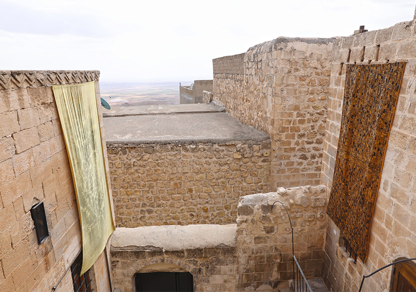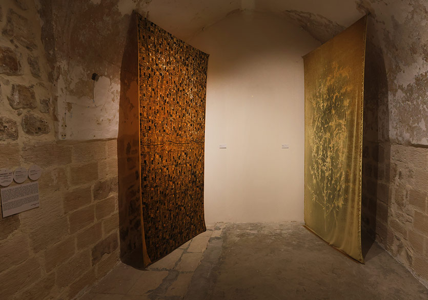 Mardin’e giden herkesin ilkin ovaya, orada onu çağıran bir şeylere, manzaraya baktığını ama kentin insanlarının ise kente, birbirilerine baktıklarını söyleyen Sidar Alışık, belki de mimari formasyondan gelen bir sanatçı olmasının da etkisiyle, şehrin silüetine, şehri oluşturan asıl kent manzarasına bakıyor. Alışık, Fulya Çetin’in birlikte şehri adımlarken kendisini sürekli durdurup yeni bir gözle şehre bakmasını sağladığını anlatıyor. Kendi şehrine belki de ilk kez bakıyor gibi yeni bir bakışla bakmaktan bahsediyor. Bu bana biraz Baudelaire’in flanörce/flanözce gezintileri, biraz da Sitüasyonistlerin başıboş gezintileri “derive”leri hatırlatıyor. Bana göre her ikisinde de ortak olan şehri dolaşırken daha önce hiç bakmadığı gibi yeni ve içeriden bir bakışla şehre bakmak ve deneyimlemek. İki sanatçı kadının, iki çift gözün Mardin’e böyle sanatsal ve taze bir bakışla baktıklarını hayal edebiliyorum ortaya çıkardıkları işlere bakarken. Biri tüm şehrin karşısına geçerek ona cepheden bakıyor; evlerle, mimari yapılarla adeta bir yüzey oluşturuyor kumaşın üzerinde. Kumaşın dokusuna işlenmiş mimari bir doku yaratıyor. Alışık’ın ifade ettiği gibi şehre o eşsiz kimliğini kazandıran Mardin taşı olarak da bilinen, insan eliyle işlenip binalarda yapı malzemesi olarak kullanılmadan önce belki de dağın kendisi olduğunu söylediği kireç taşından yapılmış binalarla kaplı olan bu mimari doku, Alışık’ın baktığı ve Mardin’de gördüğü kent manzarasını oluşturuyor. Gördüğümüz manzara, şehrin karşısında duran bu tam cepheden bakış ise adeta izleyeni bu yüzeyin ardına bakmaya, şehrin içine dalmaya, sokaklarında kaybolmaya, abbaralar arasından geçip mimari eserleri görmeye, evlerin içerisine misafirliğe davet ediyor.