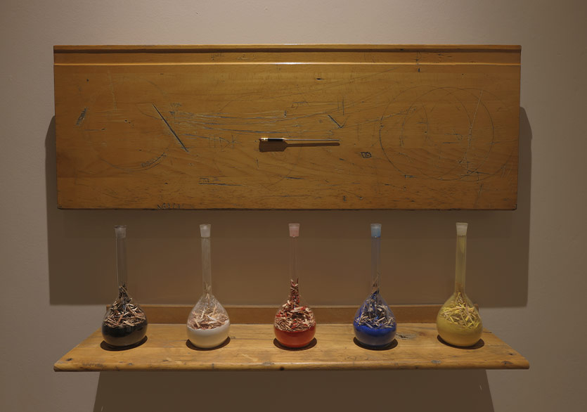 Handan Börüteçene’nin hep yazı ile şiir ile hatta kendisinin ifade ettiği gibi birer “doğum yazısı” ile başladığı işlerini hatırlatır gibi sağda camekânın içinde Konstantin Kavafis’in bir kitabı Sanat Her Zaman Yalan Söylemez Mi? ve kitaptan alınmış bir bölüm yer alıyor. Börüteçene sanat pratiğinde bazen bir arkeolog bazen bir ozan gibi çalışır, kimi zaman hayal ve mitle karışan hikâyelerini anlatır. İşlerinde kültür, doğa, (kişisel-toplumsal-kültürel) bellek katmanları arasında yaptığı kazıların izlerini ve bu katmanların birbirleri üzerine birikerek nasıl bugüne kadar devam ettiklerini görürüz. Börüteçene, kimi işlerinde ise son derece kişisel olana yönelerek kişisel bellek kasaları oluşturur. Bu kez mentörlük yapmak üzere (ilk kez) gittiği Mardin’de önce Mardin’i, oradaki insanları, sanatçıları, sanat ortamını tanımaya çalıştığını anlatıyor. Kenti tanımak ve kent belleği üzerine çalışmak kadar, birlikte çalıştığı sanatçı Rıdvan Aşar’la da kişisel bellek üzerine çalıştıklarını anlıyoruz. Birlikte şehri adımlarken şehrin sanatçının üzerinde bıraktığı his, izlenim üzerine odaklandıkları keşif sürecinde karşılaştıkları bir selvi ağacının ne söylediği ve ne anlattığı üzerine aralarında geçen bir sohbetle başlayan, çok daha derinlere giden bir yolculuğa çıkıyorlar.