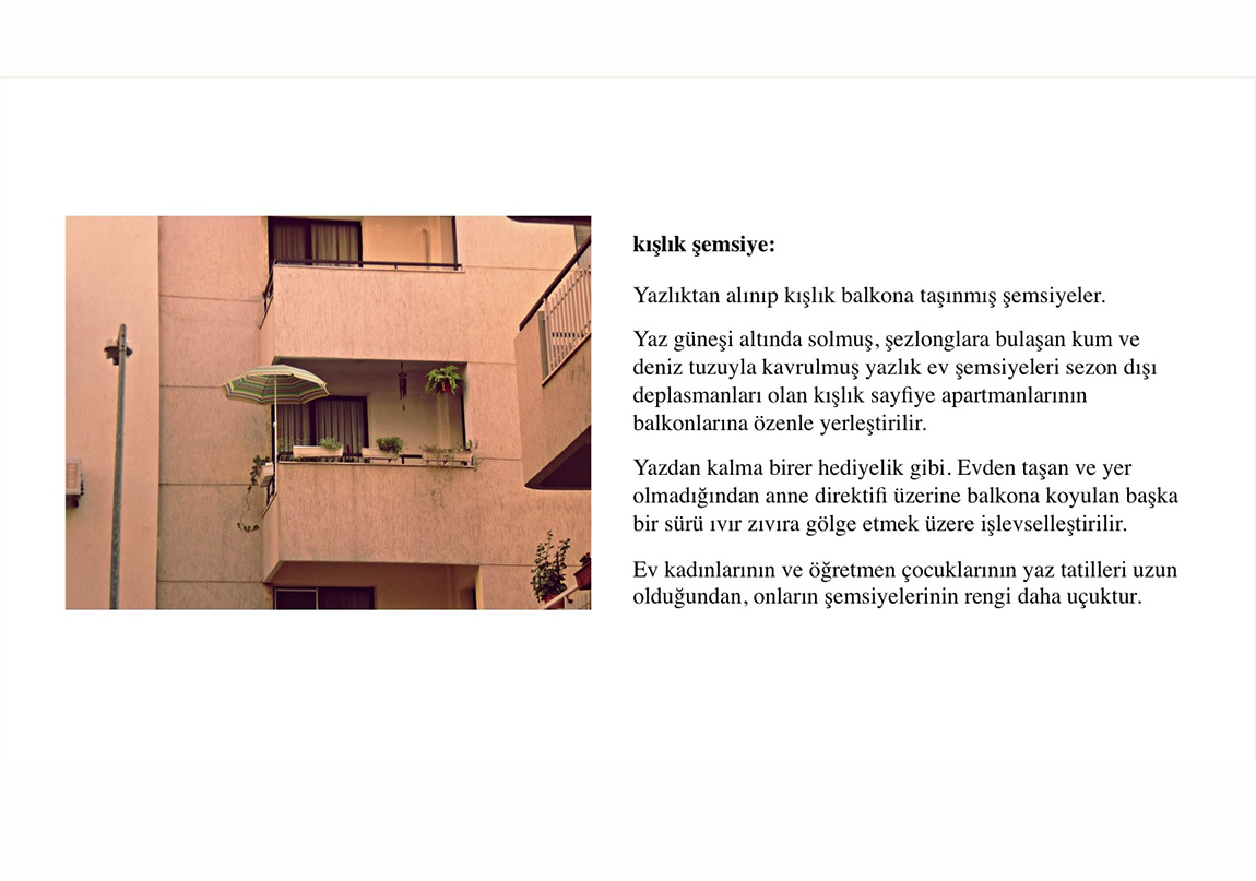 İşlerden bahsetmeye devam ederken -bütün salona dolan o hafifletici müziğin kaynağı olan- Hüseyin Bahri Alptekin’in dünyanın iki farklı plajında çektiği fotoğrafların müzik eşliğinde hızlıca akmasından oluşan ‘Incident-s Ipanema’ ve ‘Incident-s Bombay’ videolarına değinmek gerekiyor. Çoğumuza egzotik gelecek bu iki plaj, sayfiyenin bir yaşam biçimine dönüşmesinin de simgesi belki de. Serginin ana mekânının arkasındaki koridora girdiğiniz zaman Vahit Tuna’nın koridorun iki ucunda yer alan iki işi, sayfiyeden akılda kalacak küçük detaylar olarak dikkat çekiyor. Koridorda yürüdüğünüzde, Metehan Özcan’ın sayfiyenin geçmiş zamanına dair çağrışımlar yaratan ‘Resimli Bilgi, tarifler’ yerleştirmesi ve yaşanmışlığın ama aynı zamanda terkedilmişliğin de göstergesi olan eski bir yazlık evin iç mekân fotoğrafının tabloymuşcasına sergilendiği 2008 tarihli ‘Sahibinden habersiz satılık’ işi yer alıyor. Tufan Baltalar’ın koridorun ortalarındaki işleri, sayfiyenin hafızada bıraktığı silik izlerin yansımasını andıran ve yan yana sergilenen iki resimden oluşuyor. Koridor, Levent Şentürk’ün ‘Doğu’dan Batı’ya Güney’ isimli Mardin, Antakya ve Yalıkavak’ta çektiği üç fotoğrafı ve serinin tamamından ürettiği bir sanatçı kitabıyla bitiyor.Sayfiyenin değişen coğrafyalarda nasıl algılandığı ve yaşandığını belgelemeye çalışan fotoğraflar, bu okumayı doğudan batıya doğru çizdiği yolla adeta alıştığımızın tersine giderek yapıyor.