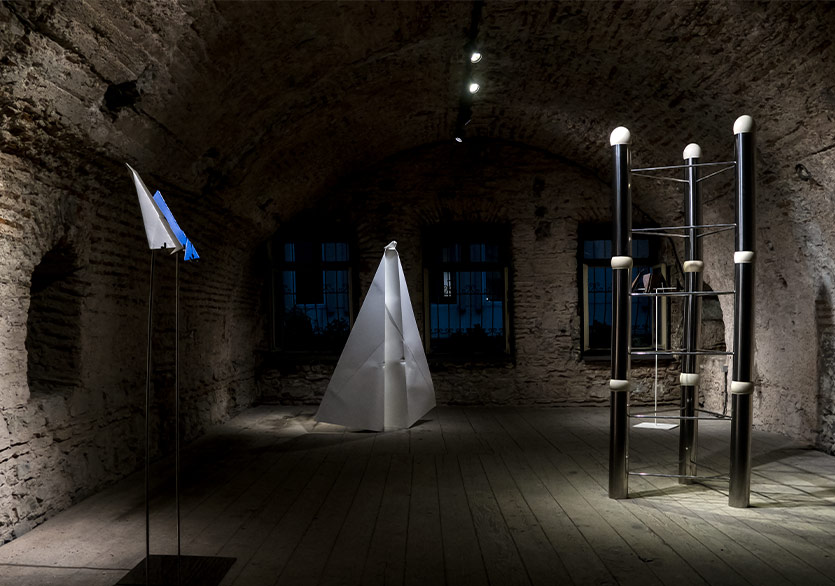 E. E.: Boğaziçi’nin kenarında durduğunuzda (kesişim noktası), ufuk dikkat çekici bir görüntü verir. Şanslı bir günde deniz, gökyüzüyle birleşir gibi görünür; ikisi birbirine karışarak görsel bir sonsuzluk hissi yaratır. Bosphorus heykelinin ayna kaplaması, onu çevreleyen duvarları ve kendi yüzeyini aynı anda yansıtarak bu akışkan geçişe gönderme yapıyor; bize, İstanbul’da yaşanan günlük deniz ve hava olaylarını anımsatıyor. Sergideki diğer işlerde de olduğu gibi, bizi sıradan olanın güzelliğini kutlamaya, gündelik hayat deneyimine onca katkısı olan küçük anları fark edip onların değerini bilmeye davet ediyor. Geminin formu tüm iterasyonlarda aynı kalmış olsa da İstanbul versiyonu, kentin su ile olan eşsiz ilişkisini galeri ortamının sınırları içinde bile hissettiriyor ve serginin ana temalarına paralel olarak, doğa ile kent ortamı arasındaki sınırsız bağlantının güçlü bir temsili.