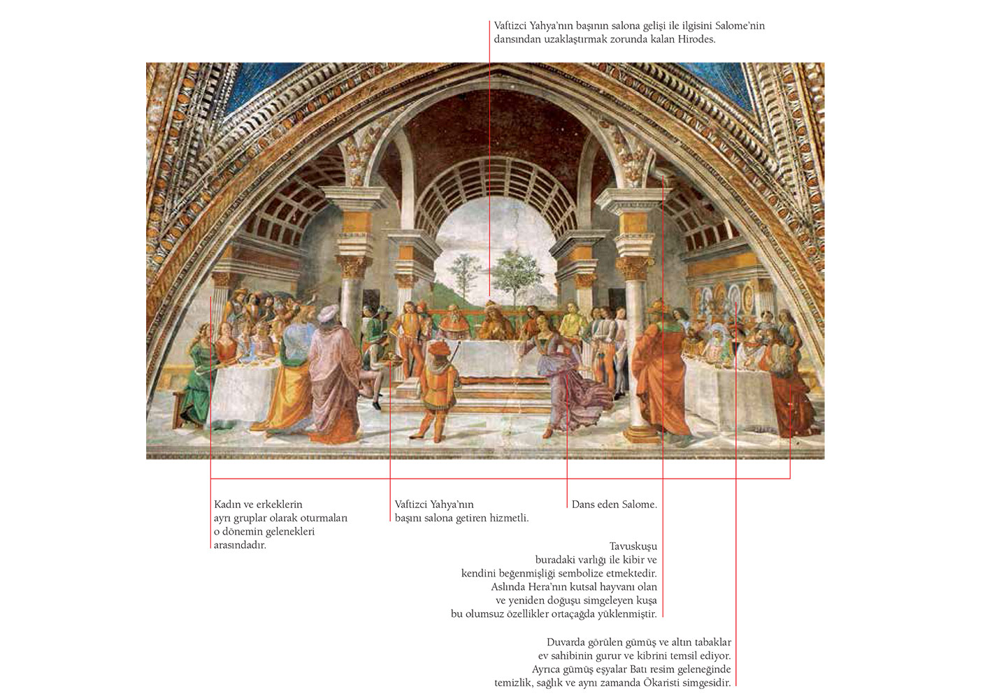 Yazarın da vurguladığı gibi, "Hıristiyan ikonografisi, Avrupa resim sanatı külliyatının büyük ve önemli bir bölümünü oluşturuyor. Bu sahnelerde sıklıkla betimlenen konular, Eski Ahit ve Yeni Ahit betimlemeleri olarak, kabaca ikiye ayrılabiliyor." Kitapta bu yönüyle ele alınan olaylar ise, Adem ve Havva, Kral Belşassar'ın Verdiği Şölen, Musa, Yehudit ve Holofernes, Süleyman Bilgece Yargılıyor, İsa'nın Doğumu Önceden Bildiriliyor, İsa'nın Doğumu, Yıldızbilimcilerin Ziyareti, Masumların Katli, İsa Marta ve Meryem'in Evinde, İsa'nın İlk Mucizesi, İsa Lazar'ı Diriltiyor, İsa'nın Yeruşalim'e Girişi, Yahya'nın Öldürülmesi, Alçakgönüllülük Örneği, Fısıh, İsa Çarmıha Geriliyor ve Diriliş olarak sıralanmış.